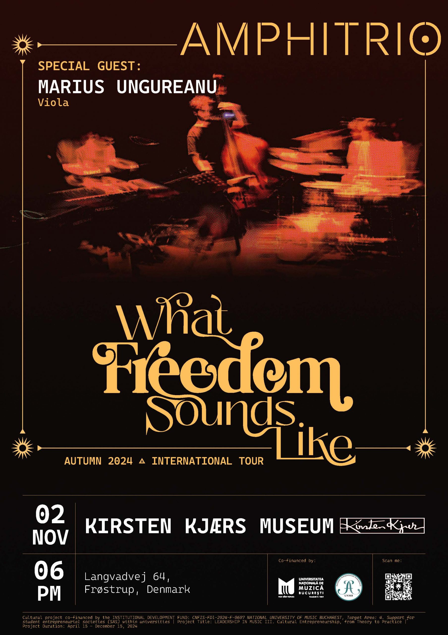 “What Freedom Sounds Like” markerer 35-årsdagen for befrielsen fra det kommunistiske regime i Rumænien og fejrer tre og et halvt årti med kunstnerisk frihed. Koncerten på Kirsten Kjærs Museum vil byde på musik fra trioens seneste album, hvor jazz blandes med folklore og giver friske musikalske perspektiver på den kulturelle arv fra Central- og Østeuropas lande.